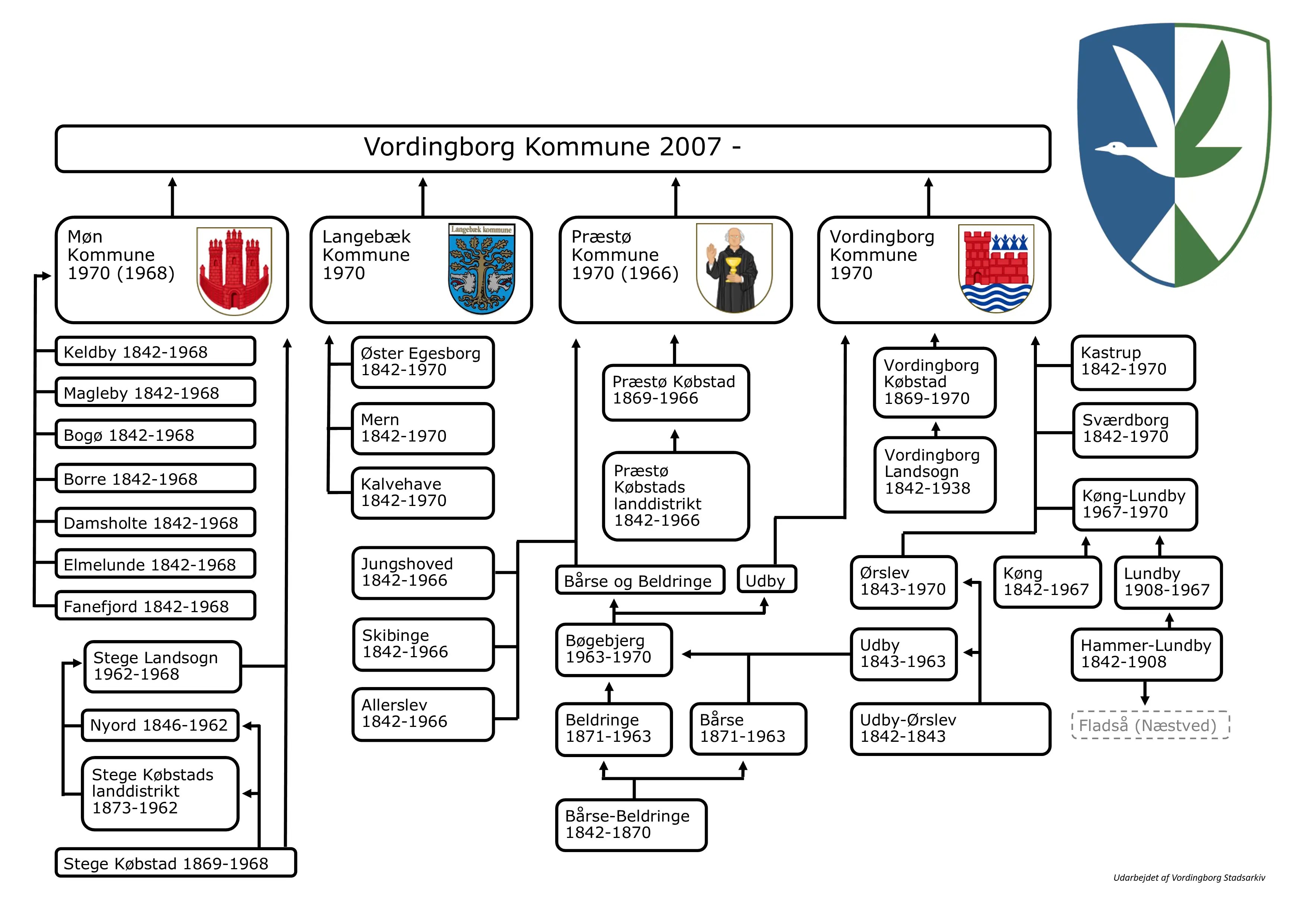 Kommunerne blev oprettet i landsognene i 1842 og i købstæderne endeligt i 1869. Her kan du følge de forskellige sammenlægninger gennem tiden, fra de helt første sognekommuner frem til nutidens storkommune.